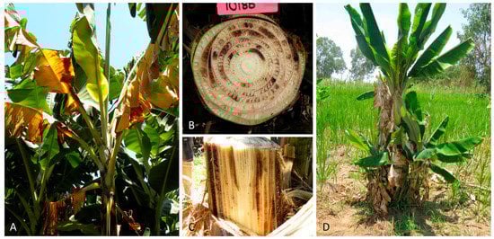 Banana plants are susceptible to several fungal and viral diseases. (A) External symptoms; and (B,C) characteristic internal vascular discoloration caused by Fusarium wilt tropical race 4 (TR4); (D) Characteristic symptoms of banana bunchy top disease.