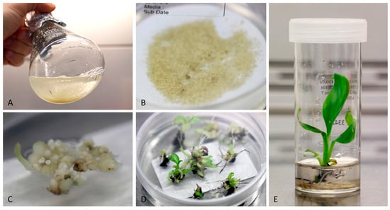 Similar to conventional breeding with the fertile diploids as a source of desired traits, GM of bananas depends on transformable tissue and genes for the target trait. The transformable tissue of choice for bananas is embryogenic cell suspensions derived from immature male flowers []. While the development of these cell suspensions is a lengthy process (Figure 2), it is probable that, with sufficient effort, it should be possible to generate them from most cultivars. In our laboratory, we have generated transformable cell suspensions from Cavendish, Gros Michel, Lady finger, and Goldfinger. Other cultivars from laboratories include the East African Highland banana, Gonja (plantain), and Rasthali. Additionally, efficient transformation protocols are available for bananas, for both Agrobacterium-mediated transformation and microprojectile bombardment [,,]. There are a number of laboratories around the world that have established banana transformation pipelines, including ours at Queensland University of Technology (https://www.qut.edu.au/), the IITA in Kenya (http://newint.iita.org/), NARO in Uganda (http://www.naro.go.ug/), the Bhabha Atomic Research Centre in India (http://www.barc.gov.in/), and the Catholic University of Leuven in Belgium (https://www.kuleuven.be/english).