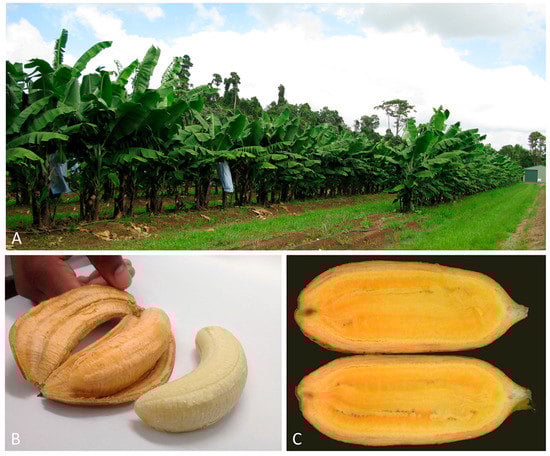 Bananas can be genetically modified to accumulate elevated levels of pro-vitamin A (PVA) in fruit. (A) Field trial of PVA-biofortified “Cavendish” banana plants in Australia; (B) PVA-biofortified fruit (left) compared to wild-type fruit (right); (C) F’i type bananas, such as “Asupina”, naturally accumulate high levels of PVA and are a source of useful genes for biofortification.