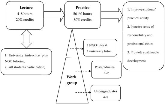 Generally, five to seven students are allocated to a group, including one or two postgraduate students and four or five undergraduate students. Each group is guided by two instructors, one from the school and the other from the ENGO.