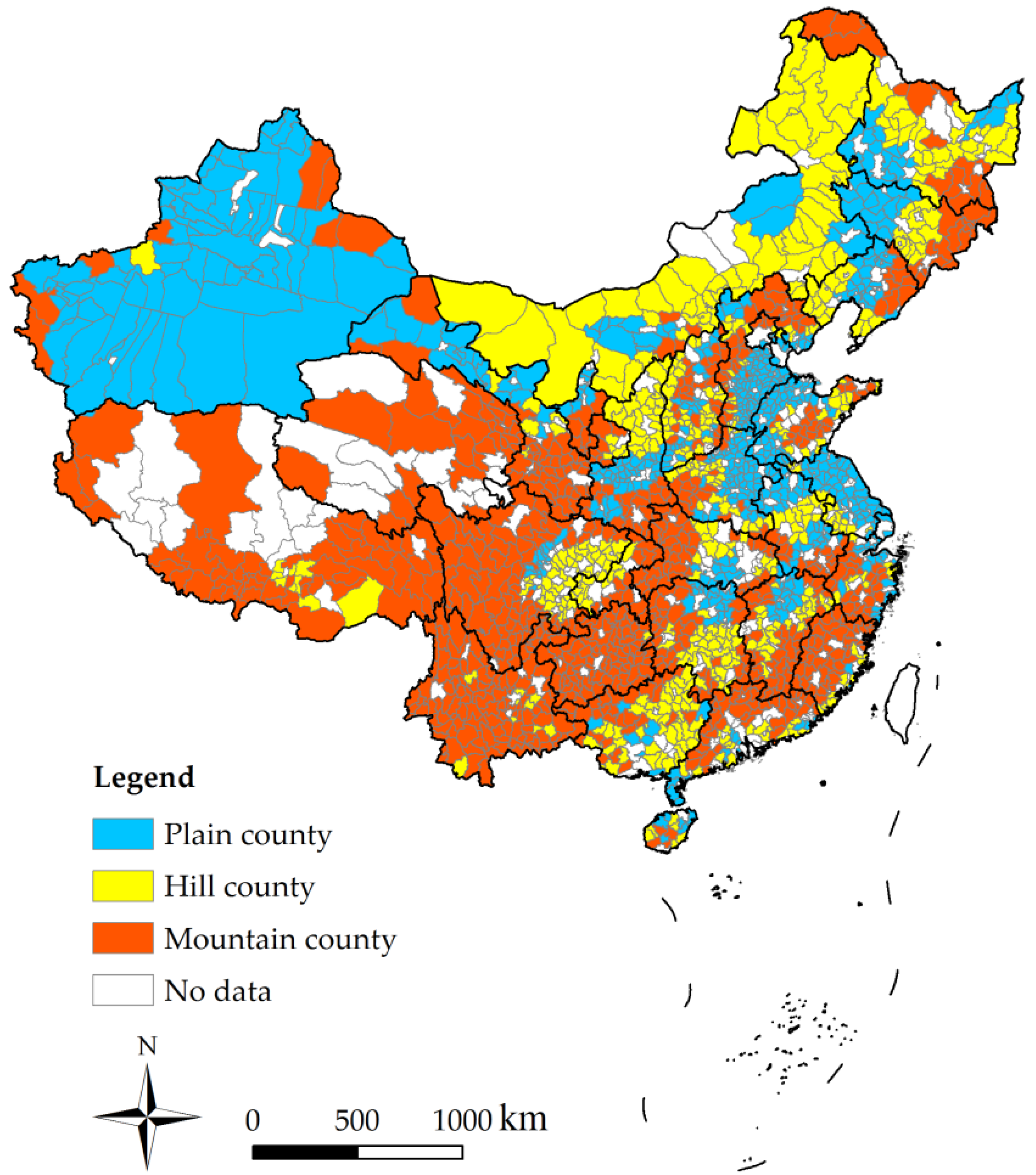 County-level dominant landform classification into plain counties, hill counties, or mountain counties based on the China County Statistical Yearbook [30].