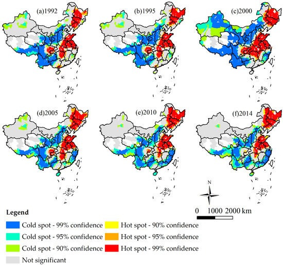 Maps of statistically significant high values (hot spots) and low values (cold spots) of Chinese grain output in 1992, 1995, 2000, 2005, 2010 and 2014 were created using the OHSA (Figure 2). Figure 2 shows that the distribution of high and low values expanded during 1992–2000 and then shrank. An apparent feature is the increased low values of grain output found in Zhejiang, Fujian, Guangdong, and Hainan.