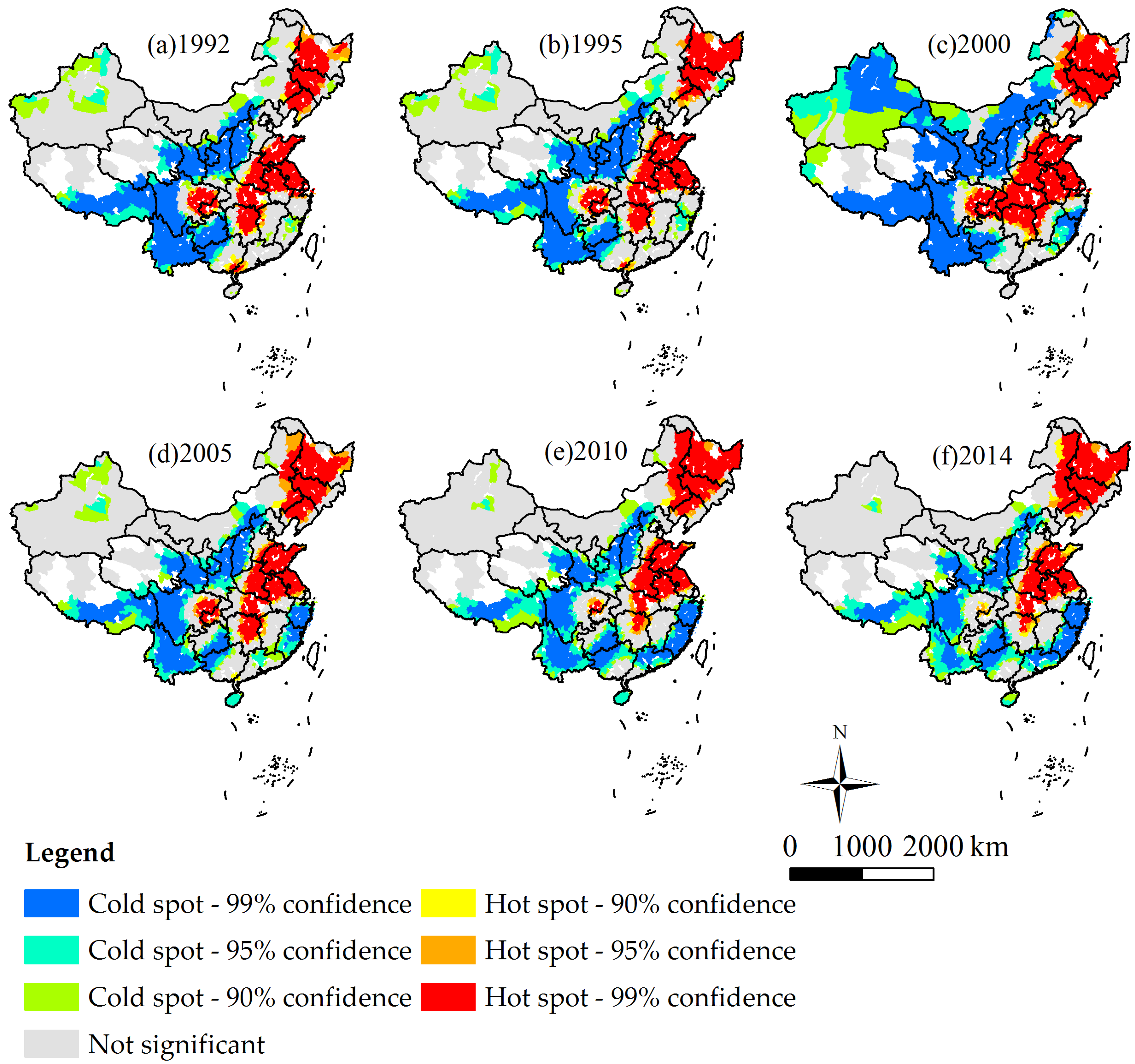 Spatial clusters of Chinese grain output. (a) 1992; (b) 1995; (c) 2000; (d) 2005; (e) 2010; (f) 2014.