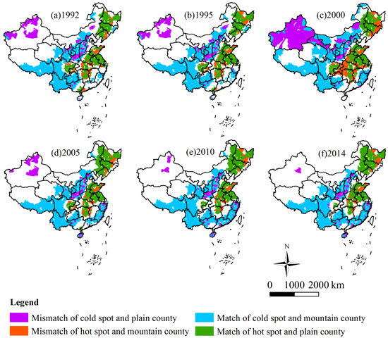 To investigate the degree of spatial match between grain production and landforms, we reclassified the maps of Figure 2, using the following rules: (1) hot spots in plain counties and cold spots in mountain counties are determined a ‘match’; (2) hot spots in mountain counties and cold spots in plain counties are determined a ‘mismatch’; and (3) hill counties are defined as grey zones, i.e., we did not consider hot or cold spots there. These rules meet the fundamental assumption that plain counties have the highest grain output, followed by hill counties and mountain counties, because of the difference in the endowments of land resources. As an intermediate level, hill counties with hot or cold spots are not the keynotes compared to plain and mountain counties as a whole.