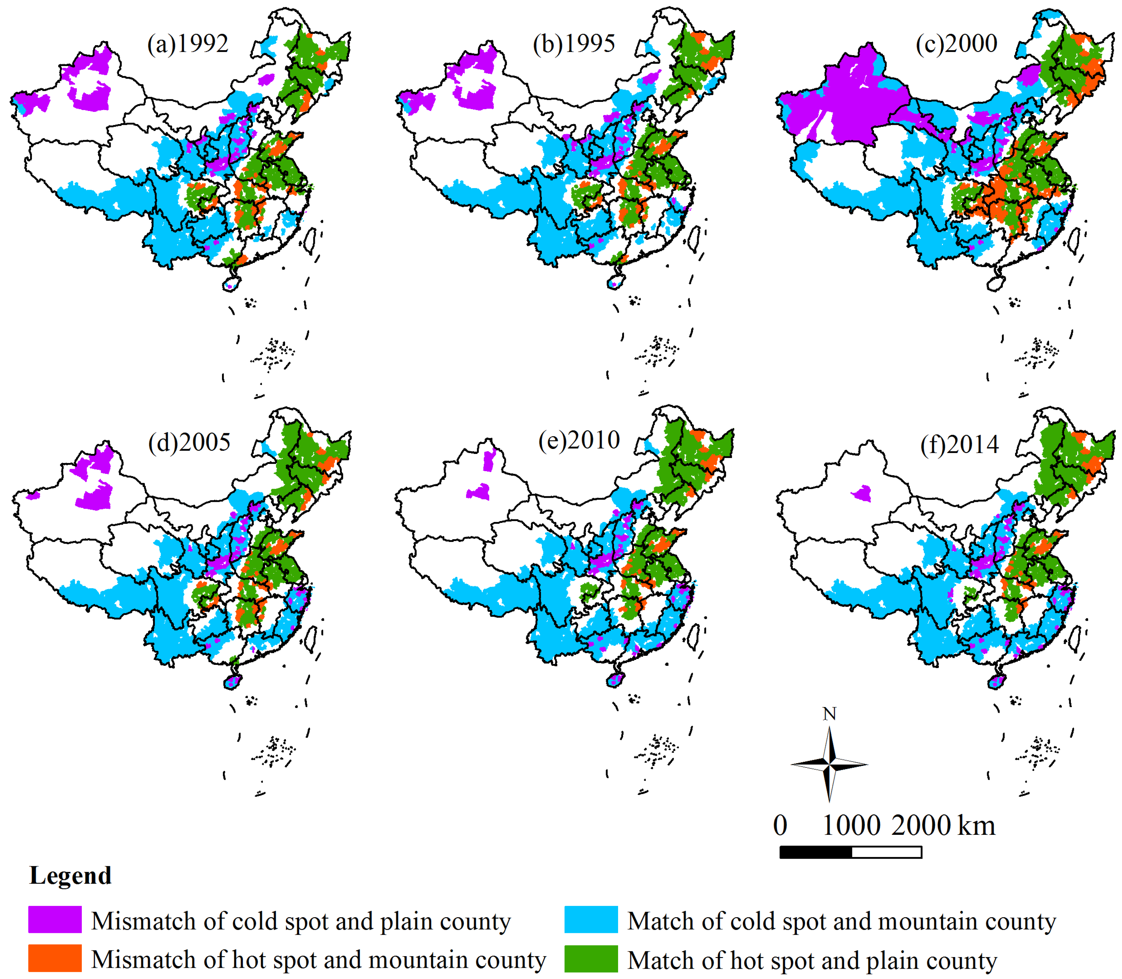 Figure 3 presents the results of the reclassification to match-mismatch. The mountain counties with hot spots in grain output are mainly located in northeast China, Shandong province, and central China. Plain counties with cold spots in grain output first increased, from 1992 to 2000, and then decreased, from 2000 to 2014, in northwest China. In southeast China, plain counties with cold spots showed a continuous increase from 1992 to 2014.
