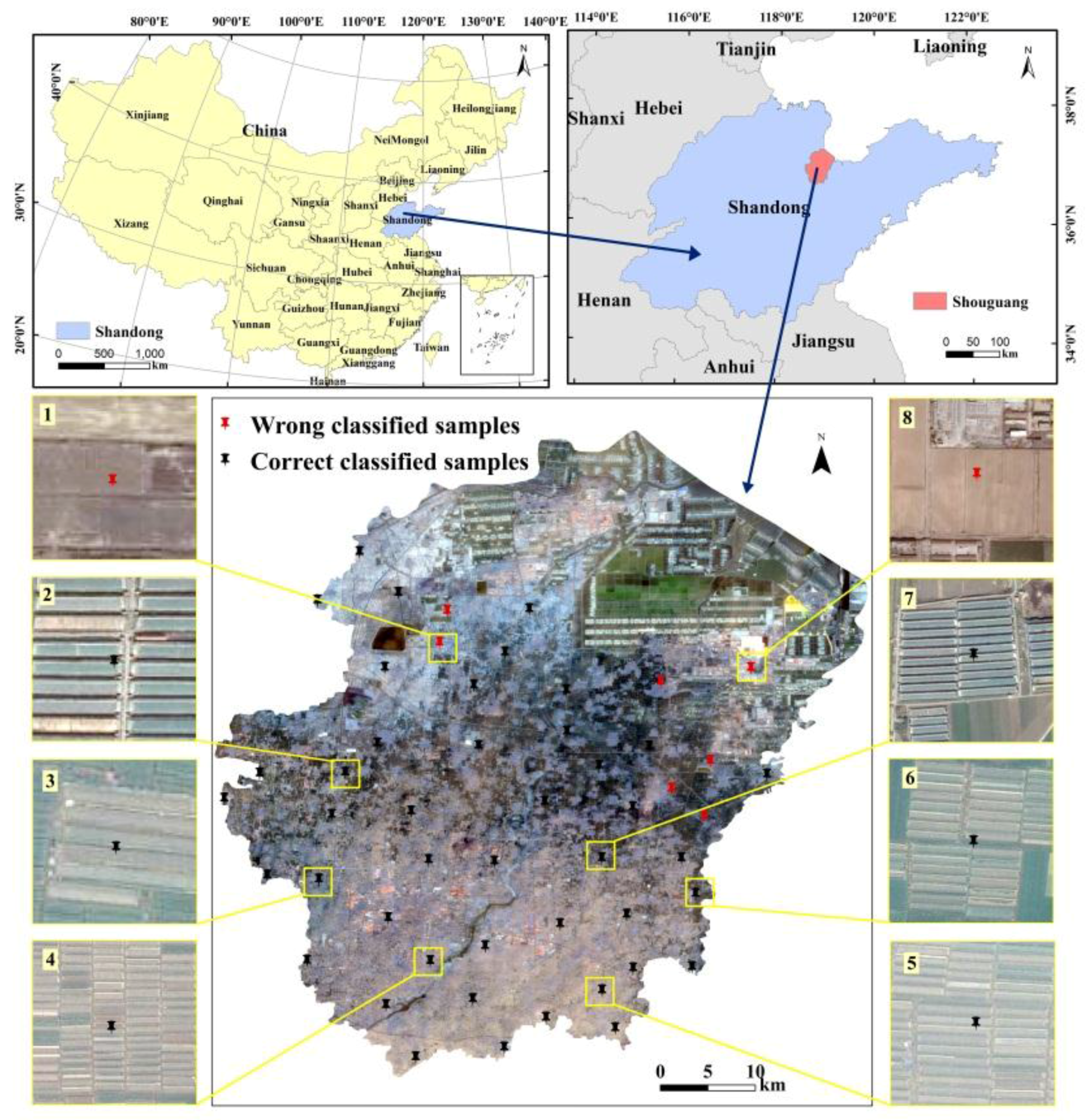 Location and classification verification for Shouguang, using ground reference data from Google Earth. We selected 50 samples classified as greenhouse land in 2015 and verified them using Google Earth images. Of these samples, the six highlighted in red were incorrectly classified as greenhouse land, while of the ten enlarged boxes, 1 and 8 actually comprise arable land. The other six comprise greenhouse land.