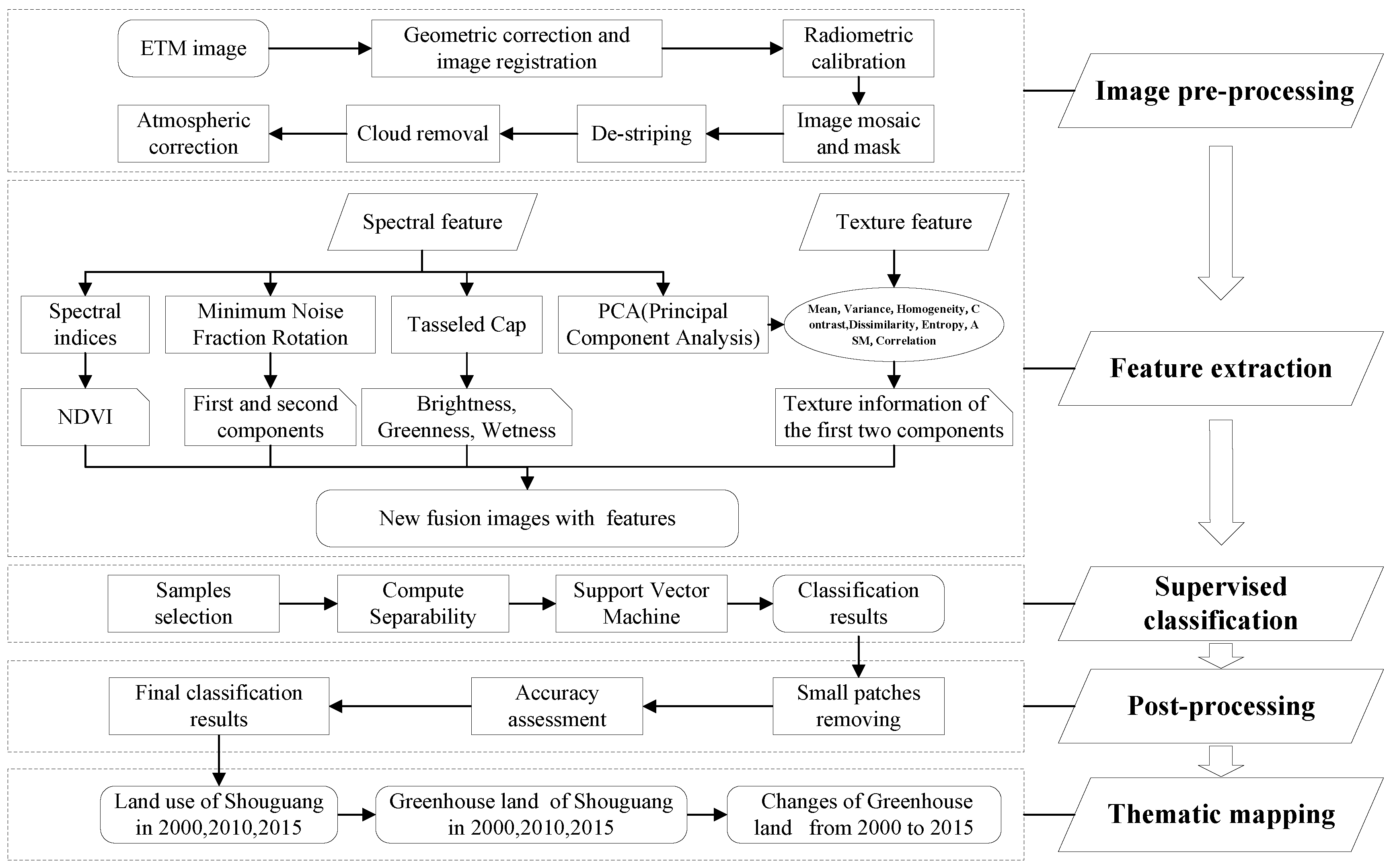 Five steps were followed in order to map greenhouse land cover in Shouguang: image pre-processing, feature extraction, supervised classification, post-processing, and thematic mapping (Figure 2). Of these, the aim of the first step, image pre-processing, is to improve image data while suppressing distortion [26]; however, as ETM images have already been geometrically corrected and radiometrically calibrated before download, we only performed image mosaic and masking processes, as well as de-striping, cloud removal, and atmospheric correction using the software packages ENVI 5.1 (Exelis Visual Information Solutions: Broomfield, CO, USA, 2013) and Arcgis 10.3 (Esri: New York, NY, USA, 2014). As a result of this image pre-processing, clearer and more accurate images of the Shouguang administrative region were obtained (see Figure S1).