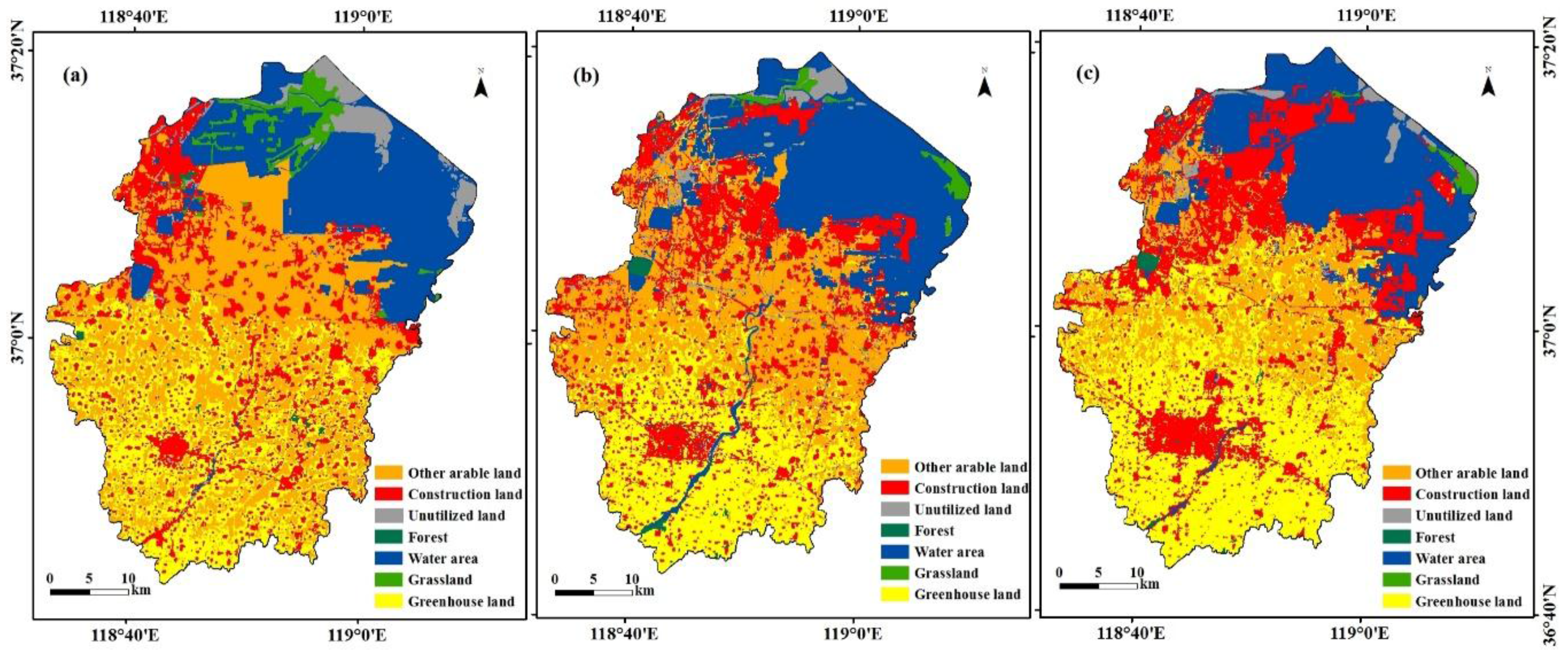In the third processing step, we used a SVM for image classification. In this context, a SVM is a machine-learning algorithm based on statistical learning theory, Vapnik–Chervonenkis dimensions, and structural risk minimization [32]. This approach enables the management of high-resolution, multiple-band images, as well as large-sized segmented satellite data [33]. Indeed, because SVMs have favorable generalization capacities, they are often used to solve small-sample nonlinear and high-dimensional pattern identification problems, as well as for prediction and comprehensive evaluation [34]. SVMs work by generating a hyperplane that represents an optimal separation of linearly separable classes in a decision boundary space [35] (see Supplementary Material for a full mathematical description). In brief, a SVM forecasts the destination values of test data by developing a model using training data. The basic process of running a SVM includes steps to select a training data set, compute separability, training using a SVM algorithm, and the acquisition of classification results. Thus, for this study, land use in Shouguang was divided into seven types encompassing greenhouses, other arable, forested, grassland, water area, construction, and unused. Training samples of these different land use types were then selected using pre-processed ETM images (see Supplementary Material for methods); separability was calculated to be 1.8, which indicates that ground features are easily distinguishable from one another. We therefore used a SVM to classify land use in Shouguang, generating three land use maps (Figure 3).