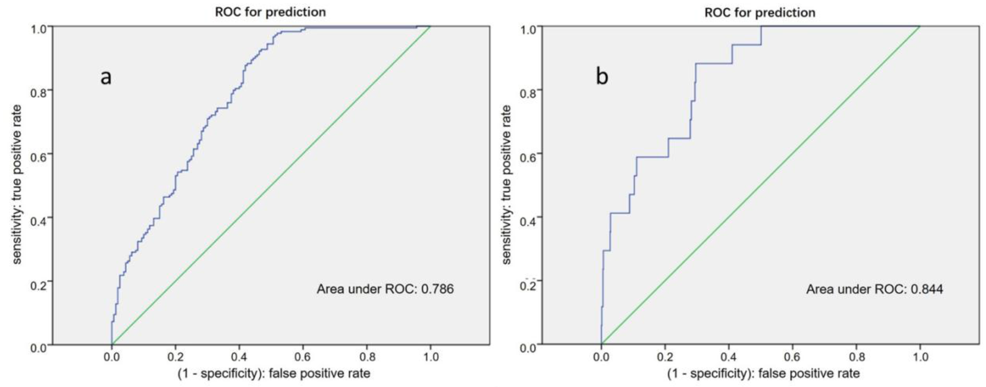 ROC curve for: expansion (a); and contraction (b) regression models. This ROC curve was used to test the degree of fit of each binary logistic regression; the area ratio under the curve corresponds to a ROC value between 0 and 1. Thus, larger is the value, the higher is the explanatory power of the logistic regression model.