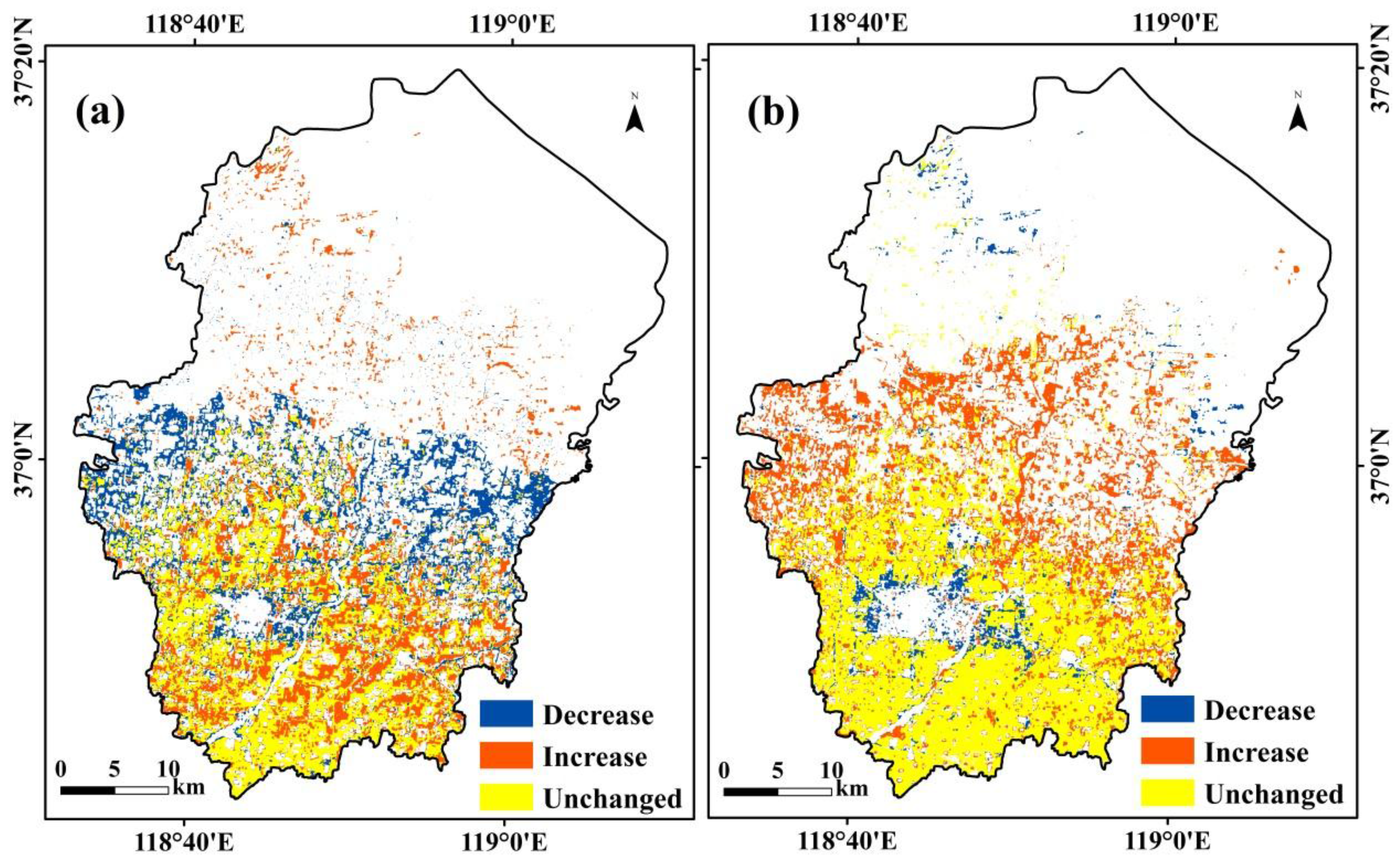 Changes in greenhouse land use: between 2000 and 2010 (a); and between 2010 and 2015 (b). A decrease denotes a change from greenhouse land to another land use type, while an increase denotes the opposite.