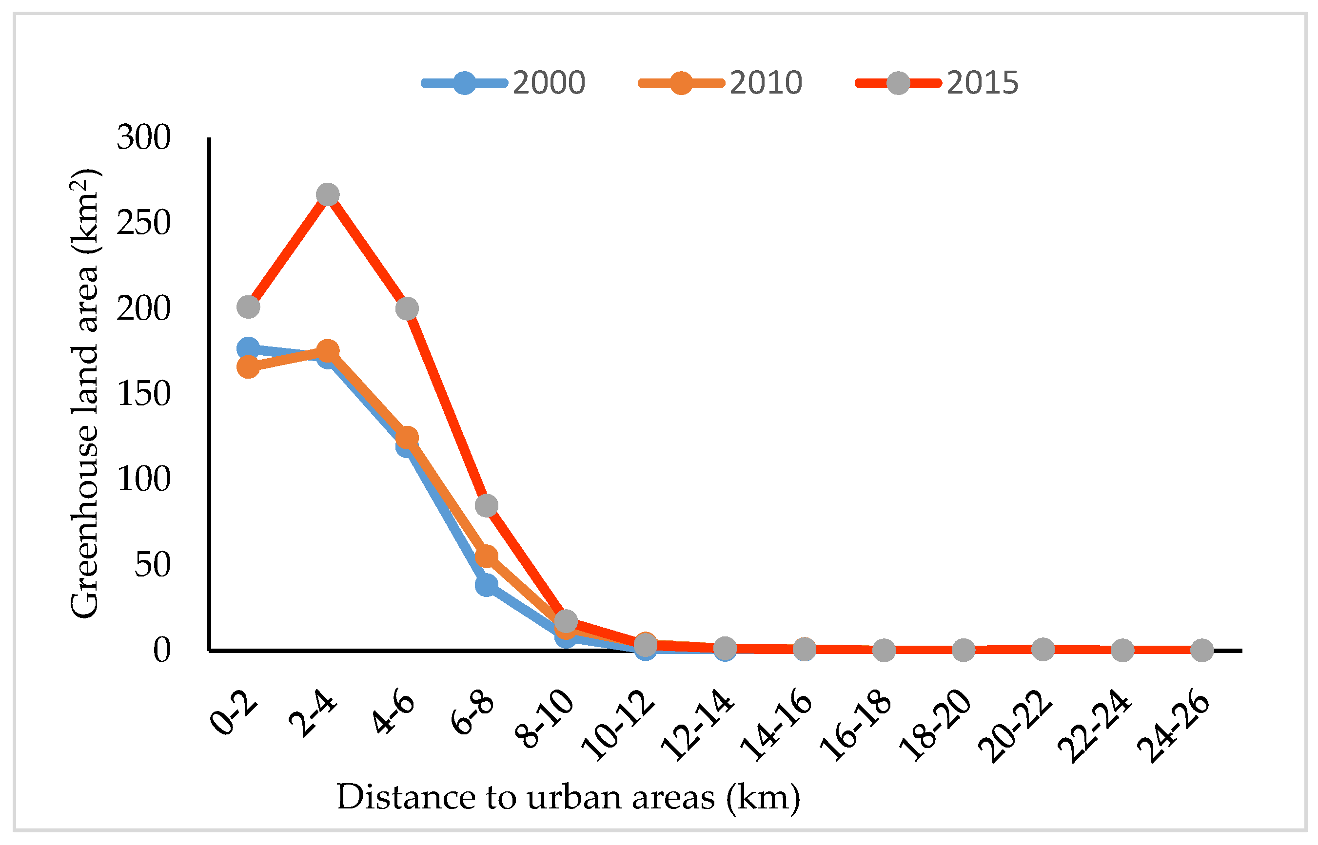 The results show that distance to the nearest urban settlement is generally negatively correlated with area of greenhouse land (Figure 6). The total land area used for greenhouses was more than 100 km2 within the three buffers closest to urban settlements (i.e., between 0 km and 2 km, 2 km and 4 km, and 4 km and 6 km). The area of this land use type also gradually declines with increasing distance from urban settlement (Figure 6); compared to 2000 and 2010, the area of greenhouse land in 2015 was increasingly concentrated within the 10 km buffer zone.
