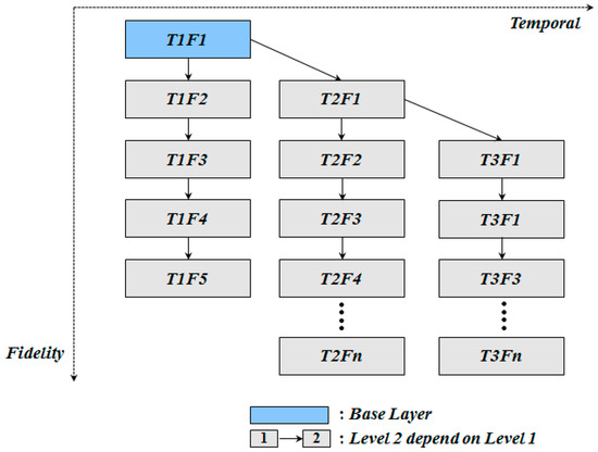 Theoretically, an MPEG stream can be divided into 192 different layers by applying time and other division methods. The time division method produces up to 15 video layers that exhibit inter-dependencies as shown in Figure 3. Here, “n” represents the number of layers generated using spatial division. The base layer T_layer1 is a time division layer used to decode T-layer2, which in turn is used to decode T_layer3.
