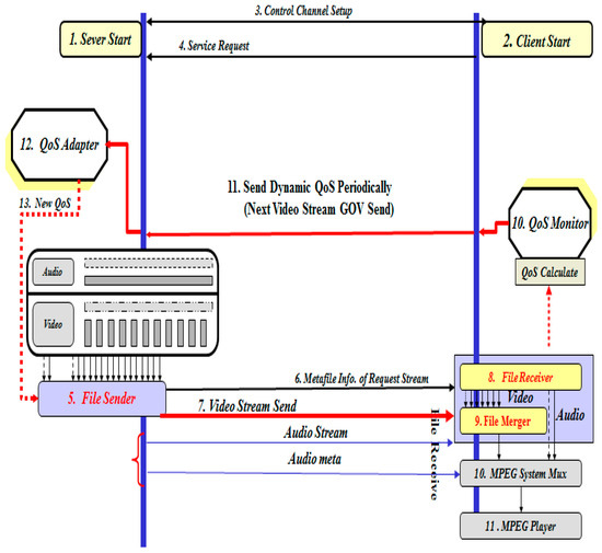 Figure 5 illustrates the temporal-fidelity scalability method used in transferring data from a server to the client. Steps 1–4 show the initial server and client states. The server sends a requested multimedia file to the client first and the actual multimedia data later as shown in steps 5–7. The received file is merged into a single file using the merging module. As shown in steps 8–11, this is played back to the client via a player. The QoS Monitor obtains the current session information based on the multimedia data (steps 10–11). This information is resent to the server QoS Adapter, which determines the data to be transferred next (steps 12–13).
