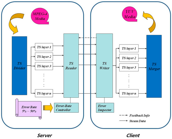 Figure 8 illustrates a simulation environment for the performance evaluation of the proposed algorithms. The streaming server was implemented in Visual C++ under Windows 2000, and the client experimented with a laptop using an Intel Core (TM) i3 CPU. The TS (Transport Stream) Divider is responsible for dividing; the TS Sender is in charge of sending the divided stream; the TS Writer is in charge of data receiving; and the TS Merger decodes the received data. The Error Rate Controller determines the loss of the packet sent and the Error Inspector measures the indirect data loss between the higher layer and lower layer in accordance with the presented error rate.