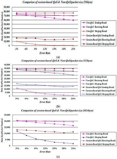 The data transmitted using the non-QoS and session-based adaptive QoS techniques was not large in size. However, the final merged multimedia data showed big differences because the relationship between the layers was different. Figure 9a–c show the comparison results. This demonstrates that the lower layer can only be decoded by using higher layer data and that the loss of higher layer data can result in loss of lower layer data. To minimize this, the session-based method transmits this layer using TCP, resulting in a more reliable transfer as compared to UDP. The transfer time is reduced, however, reliable transfer is acquired. This difference widens as the packet size increases. As the data transfer rate decreases, the data transfer failure possibility and the indirect loss size increase.