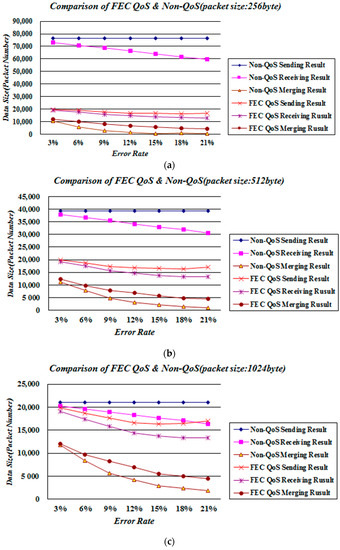 Figure 10. (a) FEC method adaptive QoS and non-QoS-1; (b) FEC method adaptive QoS and non-QoS-2; (c) FEC method adaptive QoS and non-QoS-3.