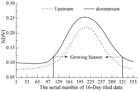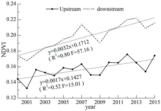 The average value of MODIS NDVI from 2000 to 2015 over a 16-day interval in Shule River Basin is acquired using ArcGIS software (Environmental Systems Research Institute Incorporation, Redlands, CA, USA). The growing season of vegetation begins on 113th day of the year and ends on 320th day of the year, with a length of 208 days (Figure 2). The peak of NDVI appears in the end of July. Changing curve in downstream area shows a higher NDVI value than that in upstream area, and both curves have inverted-U shapes (Figure 2). The yearly average NDVI during growing season (NDVIgs) shows a linear uptrend over the years, especially in the downstream area (Figure 3). This result is consistent with some existing study [].