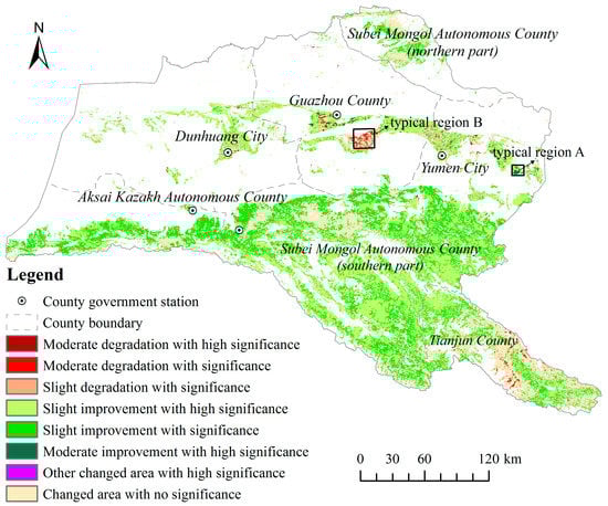 The greening areas, that is, areas with slightly, moderately or highly improved NDVIgs, accounts for 92.70% of the total areas (Table 1). Among them, 69.45% are distributed over upstream region, Aksai Kazakh Autonomous County, Subei Mongol Autonomous County (southern part) and Tianjun County account for 8.87%, 44.74% and 15.84%, respectively (see Table 2). The main vegetation types include the steppe, the desert steppe and the alpine meadows. The remaining greening areas (23.25% of the total areas) are distributed over downstream region, especially newly developed agricultural areas, including Yumen City, Guazhou County, Dunhuang City and Subei Mongol Autonomous County (northern part), and their shares are 9.09%, 5.88%, 4.26%, and 4.03% of total vegetation area, respectively (Table 2).
