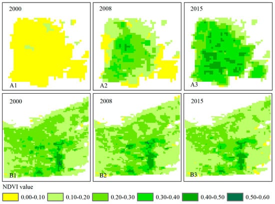 To reveal the spatial process of vegetation variation with time, we chose two typical regions with vegetation improvement (A) and degradation (B) (Figure 4) for further microscopic analysis (Figure 6). Region A is an agricultural area under irrigation in Gobi desert, which is newly developed during the implementation of Shule River Basin Agricultural Irrigation and Immigration Development Projects. There is a rapid increase in vegetation coverage in this area from its center to its fringe during 2000–2015 (Figure 6). Region B is a natural vegetation area named Gansu Anxi National Nature Reserve in Hyper-Arid Desert. In 2003, the Shule River was cut off for the construction of upstream Changma reservoir. Then, the water was transported through concrete-lined canals to irrigation areas. Thus, there is little surface water in Changma alluvial fan, which could not replenish groundwater, resulting in severe decrease in groundwater level in Region B. Therefore, the coverage of vegetation whose growth is highly dependent on groundwater is decreased gradually from fringe to center of this area during 2000–2015 (Figure 6).
