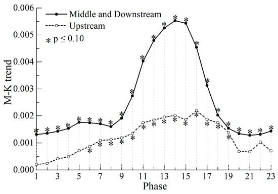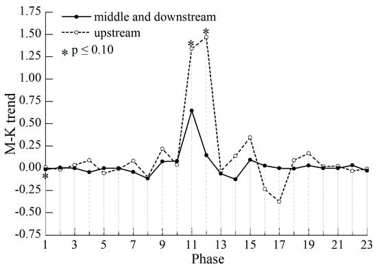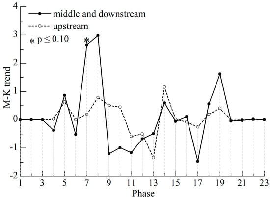 M-K method is a non-parametric test for assessing the significance of a trend [,]. If {xt} is a time series with n samples, statistics S can be defined as follows: