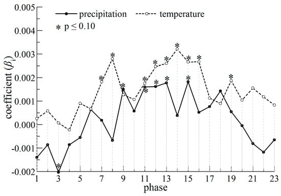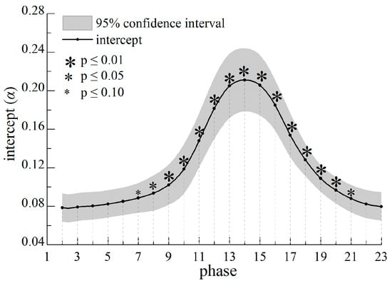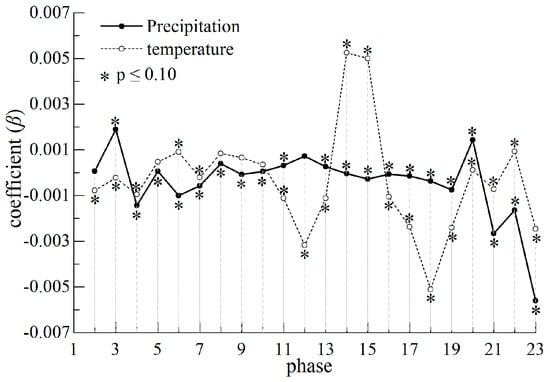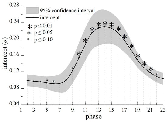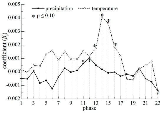 αi begin to rise in about phase 7 (about early April), peak in phase 14 (28 July to 12 August), and then decline, and form an inverted U-shaped curve (Figure 10 and Figure 11). Most of the t tests in growing season are significant at p ≤ 0.05 level. Obviously, αi (individual effects) seasonally changes, which is consistent with the process of plant growth. In addition, αi rises over the years (time effects), but the variation is small and most t tests are non-significant (Figure 12 and Figure 13). Thus, the intercept item αi mainly changes with phase (individual effects are more significant than time effects).