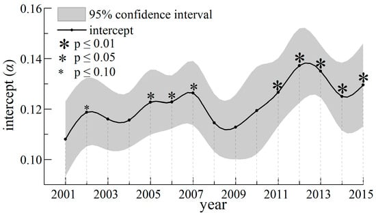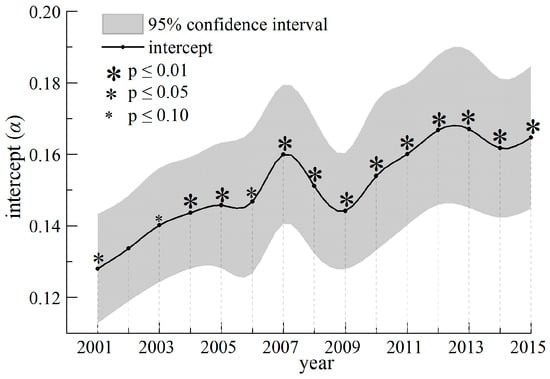 β consists of β0 and βi in RC models, and βi is the variable coefficient with phase and year. The estimation results of αi and β0 are shown in Table 9. Although some t tests for β0 are not statistically significant, χ2 tests of parameter constancy reach significance level at p ≤ 0.01. Some t tests for βi are very significant (Figure 16 and Figure 17). Therefore, we reject the null hypothesis H2 that coefficient is constant. Unlike variations in intercept term αi, β variations lack smoothness or regularity, and the process and extent of change are also different among phases and regions.