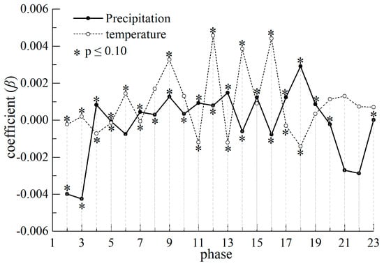 All β values calculated by Equation (6) are positive, which means that NDVI has significantly increased during 2000–2015. In addition, great variations in NDVI mainly appear in the growing seasons (phases 8–20). The variation range in downstream area is much larger than that in upstream area (Figure 7). The increasing trends of total precipitation and accumulated temperature (≥0 °C) are far less obvious than that of NDVI. Their β values are near zero in non-growing season (from phase 20 in current year to phase 6 in the following year), and only a few β values in growing season reach the significance level. The maximum β values of accumulated temperature appear in phases 7 and 8 (6 April to 8 May) in downstream area, which means that increased temperature during vegetation recovery stage has positive impacts on NDVI (Figure 8). Similarly, precipitation is significantly increased in phases 11 and 12 (10 June to 12 July), when vegetation is in vigorous growing period under good hydrothermal conditions. Thus, the increased precipitation is very favorable for plant growth (Figure 9). This is consistent with relevant research, which considered that vegetation growth is mainly controlled by temperature in spring and autumn, and precipitation in summer [].