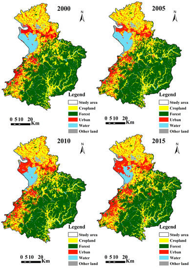 Four series of imagery (2000, 2005, 2010 and 2015), including Landsat 5 (resolution: 30 m × 30 m) and Google Earth were used to extract land cover information. Landsat Thematic Mapper images were collected for the years 2000, 2005, and 2010, and Google Earth maps were collected for the years 2000, 2005, 2010, and 2015. First, atmospheric and topographic corrections were conducted in ENVI5.1 software, and the root mean square error was limited to within 0.5 pixels. Data from 2010 were first interpreted, and the land cover maps for the other years were updated based on these data. The eCognition object-oriented classification and the decision tree were used to make the initial classification [33], including cropland, forest, urban, water and other land. In this classification, other land comprised grassland, bare land, and so on. A visual interpretation method with Google Earth and land use maps in 2012 and 2014 were then employed to modify the classifications. Approximately 1200 samples from ground survey data and stratified random sampling were selected during a field survey in 2009 to assess the accuracy of the classification. The overall accuracies were approximately 90%, and the Kappa coefficient was 0.8. The accuracies of all four forest landscape maps were also approximately 90%. The amount and distribution of land cover in four years are shown in Table 1 and Figure 2.