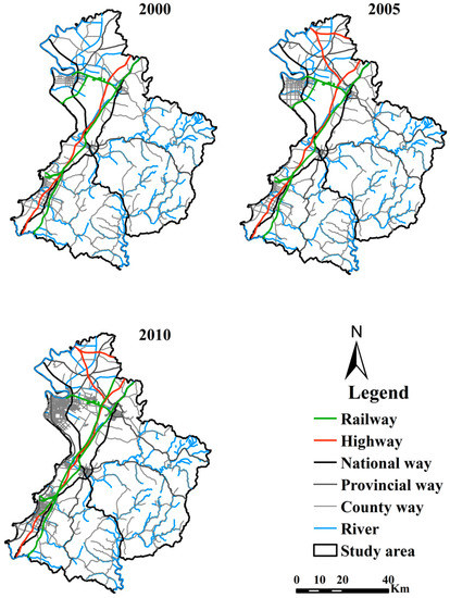 Roads (highways, national ways, province ways, and county ways) and rivers were obtained from the historical traffic maps of Liaoning. Maps of Google Earth in 2000, 2005 and 2010 were used to modify the road and river datasets via the visual interpretation method (Figure 3).