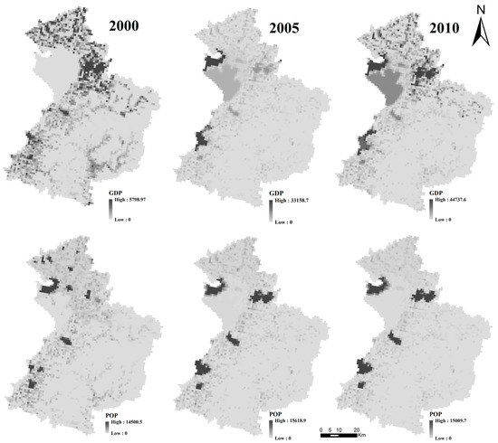 Distributions of population (POP) and gross domestic product (GDP) of Yingkou region, China in 2000, 2005 and 2010.