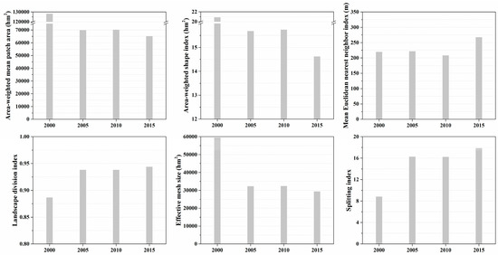 At the total forest landscape level (Figure 5), area-weighted mean patch area, area-weighted shape index, and effective mesh size decreased from 2000 to 2005, increased from 2005 to 2010, and decreased from 2010 to 2015; the change trends of mean Euclidean nearest neighbor index, landscape division index, and splitting index were the opposite. These results showed that the forest landscape was more subdivided, isolated, and regular in the period of 2010–2015. Upon comparing all the selected metrics at different scales and times (Appendix A), the value changes were all concentrated in the southwest of the study region or around the development area. These data indicated that the western area experienced a significant amount of landscape change and forest fragmentation.
