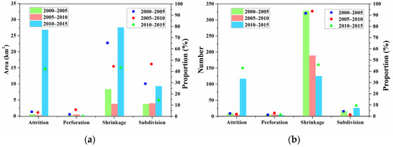 Area (a); and number (b) of different spatial processes in 2000–2005, 2005–2010, and 2010–2015.