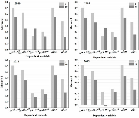 Figure 9 shows the global Moran’s I coefficients of all forest fragmentation metrics at two different scales in four years. These values detected the spatial dependence within the neighborhood. In general, most of these coefficients were greater than zero at the two scales, indicating the commonly positive spatial autocorrelation in forest fragmentation in Yingkou region. Therefore, spatial scale effect and autocorrelation should be considered in the analysis of the driving factors of forest fragmentation.