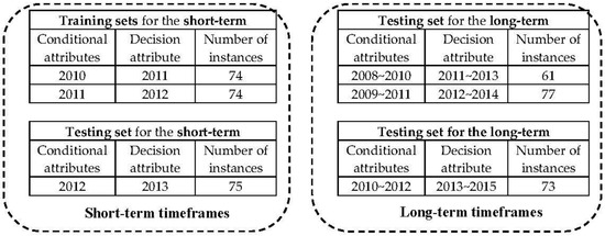To induct rough logical relations, data should be defined as an information system (IS), where . In a DRSA IS, is a finite set of universe; is a finite set of k attributes (i.e., ); is the value domain of attributes (i.e., ); and denotes a total function (i.e., ), where for each and . The attributes comprise of conditional attributes C and a decision attribute D for a typical MCDM problem. To learn the logical consequences of financial changes in this study, the condition and decision attributes are further denoted as and at time periods t and t + 1, respectively.