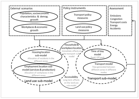 The MARS model is implemented in Vensim®, a System Dynamics programming environment. The model includes a transport sub-model that simulates the travel behaviour of the population, a housing location sub-model and a workplace location sub-model. The sub-models are executed iteratively over a period of up to 30 years, being linked by two factors, namely the accessibility and the location of households and workplaces [50]. Figure 1 shows the basic components of the Model. The external scenarios and policy instruments are inputs for the MARS model. The external scenarios include a number of variables in relation to demographic and economic growth, transport data and land use development. The policy instruments are policy interventions which modify the conditions of the land use sub model or the transport sub-model. The transport sub-model generates and distributes the trips of residents between the different zones and for different modes. The land use sub-model allocates workplaces and residents in the different zones. The accessibility to workplaces acts as an output in the transport model, while as an input in the location sub-models. The distribution of residents and workplaces acts as an output in the land use model. The results from this iterative process are used for assessing the policy instruments.