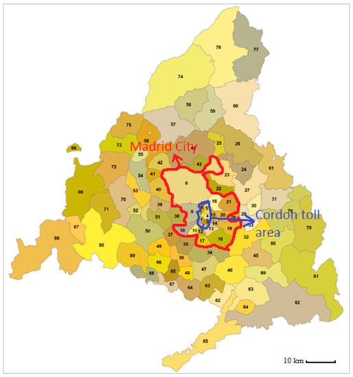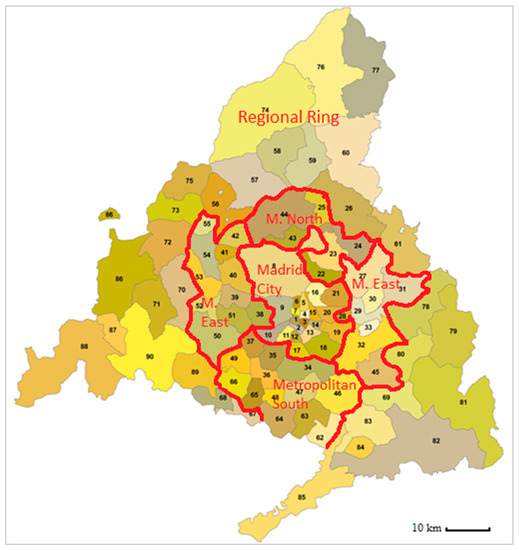 MARS model divides the whole Region of Madrid into 90 zones (Figure 2). These zones, classified by Guzmán [51], are homogeneous territories in the terms of socioeconomic characteristics and mobility patterns. In the city of Madrid, where 50% of the Region’ population lives, the zone aggregation is served at a district level. In the metropolitan ring, where 42% of the population lives, the zones correspond to different municipalities. The zones in the regional ring, which only account for 8% of the population, comprise various municipalities.