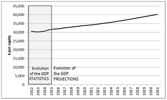 The Do-nothing scenario is defined and executed in the model in order to compare the effects of implementing the three policy measures with not taking any particular action. However, in this subsection, we present the most important inputs to be implemented in the model for the long term assessment: economic and demographic growths. In order to input the economic growth, we implied the OECD database [57], which provides economic projections (Figure 3). The model considers an economic growth rate for the whole Region, and then redistributes workplaces and residents in the different zones. This economic growth is the same in the four policy scenarios.