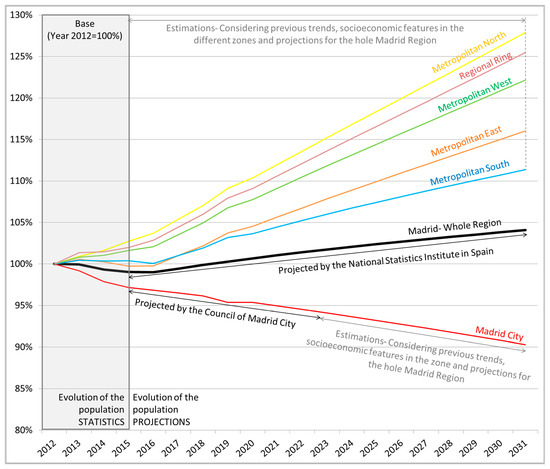 - Socio economic data, i.e., population per zone and population growth per aggregated region (city, metropolitan north, east, south or west and regional ring), household budget per zone, motorisation rate per zone, etc., were mainly obtained from the official statistical sources, provided by institutions at the city, regional and national levels [33,54,55].