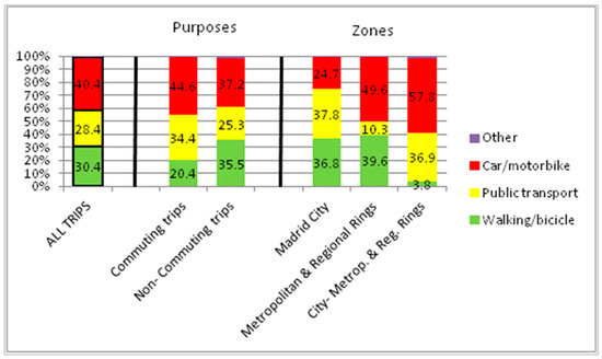 Modal share of daily trips in Madrid Region by purposes and zones. Data source: [36].