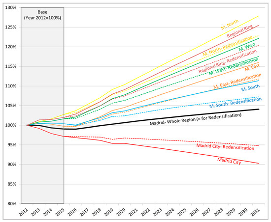 Data on demographic growth were provided by Madrid City Council database [54], which gives the population projections until 2023 for Madrid City, and by the National Spanish Statistical database (INE) [55], which gives the population projections for the whole Madrid Region until 2031. There are no official projections of the population in Madrid beyond 2031. For this reason, we have limited the study and the analysis of this paper to 2031. Regarding the demographic growth, the model considers six different population growth rates for the following aggregated regions: Madrid City, Metropolitan North, Metropolitan East, Metropolitan South, Metropolitan West and Regional Crown (Figure 2). For this study, the growth rates of each zone were calculated on the basis of the projections for the city and the whole Madrid Region. The internal distribution of the population between the different aggregated regions was performed by adopting a similar methodology to that adopted by INE [55] for Madrid Region, which can be consulted in [64], and is based on the socioeconomic features of each zone (Table 5). Logically, the zones where the population is younger and the average birth rate is higher, show higher growth rates, i.e., Metropolitan North or West and Regional Ring. Conversely, the population of Madrid City is expected to decrease [54], being characterised by the highest death rate and a negative migration balance. These social characteristics of the different zones draw part of the urban sprawl picture, e.g., young families move out of the city centres, looking for better environments and more affordable houses [19]. The final growth rates fed in the model are shown in Figure 4, and are the same in the cordon toll + PT and the teleworking scenarios. The re-densification scenario consists of changing the redistribution between the city and the outside rings, and therefore considers a different internal distribution of the population.