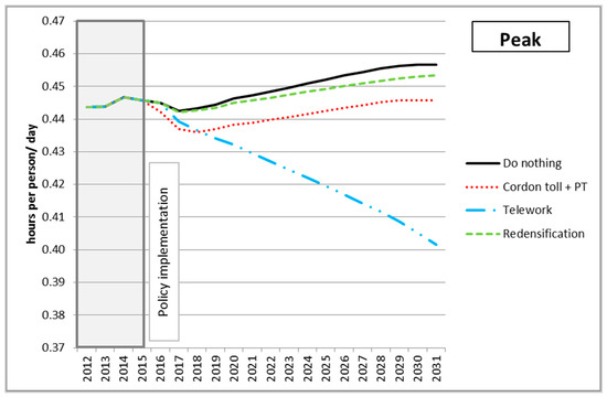 Evolution of time travelling at peak hours in the three policy scenarios, MARS output.