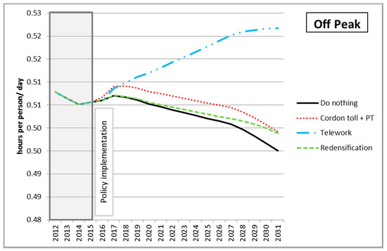 Evolution of time travelling at off peak hours in the three policy scenarios, the MARS output.