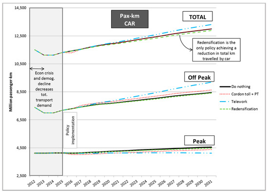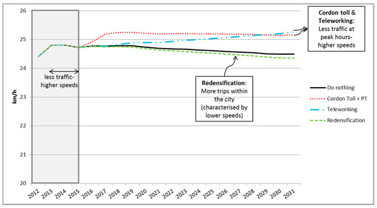 The results of the four simulations corresponding to the four scenarios defined are presented in Figure 8, Figure 9, Figure 10, Figure 11, Figure 12 and Figure 13. The figures show the variables with the greatest influence in the policy assessment results, which are based on the values of the indicators associated with the different city challenges (Table 3 and Table 4). The figures cover each year of the simulation period, from 2012 (Year 0) to 2031 (Year 19): time travelling, passenger-km, car speed and CO2 COs emissions. In addition, Figure A1, Figure A2 and Figure A3 in Appendix A show the causal loop diagrams for the calculation of these variables in the MARS model. Figure 8 and Figure 9 show the time travelling per person. The three policies achieved time savings in commuting trips and reduced the traffic at peak hours. In the cordon toll and teleworking scenarios, the car speed increases due to the improved traffic flow. This is translated into an economic value, and is good in terms of efficiency and reduces congestion. However, the time budget per person and day is more or less constant, and in the three scenarios, people travelled more during nonpeak hours and for not for work reasons. In some scenarios, this resulted in an increase in the total vehicles-km travelled, also increasing the total emissions and energy. This is especially the case of the teleworking scenario, where the trips to work keep decreasing over the years. In fact, the only scenario which achieved a reduction in the total km travelled by car was the re-densification scenario, through a reduction of distances and increasing the trips within the city, which are based more on walking and PT. In the first year of the simulation process (2012–2013), the growth of the economy and the population are still negative, due to the economic crisis that hit European Continent in 2007 [79]. This results in a reduction of trips and emissions from 2012 to 2013. From 2014 to 2015, the economic indicators start to recover and positive growths for the economy and the population are expected in the upcoming years [54,55,57].