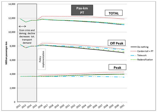 Evolution of passenger-km travelled by public transport in the three policy scenarios, the MARS output.