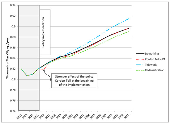 According to Census surveys carried out by the INE [55], in Madrid Region, the number of people working at home has grown from 2.4% in 2001 to 8% in 2011. In view of this growth, and considering feasibility studies on this topic [73,74,75], we considered that teleworking encouragement policies could achieve a reduction of a 10 per cent in trips to work by 2031. Teleworking practices could be part of the workplace mobility plans that the public authorities of Madrid Region intend to establish [36,37]. For the implementation of teleworking in the model, this reduction is assumed to be linear. It is supposed to increase from 2016, where there is still no reduction, to 2031, where a 10 per cent reduction on the commuting trips will be achieved. Teleworking policy measures have also been assessed earlier with the MARS model by other authors [50].