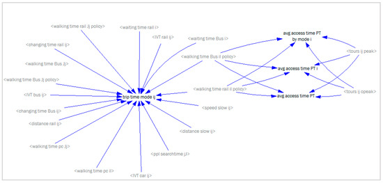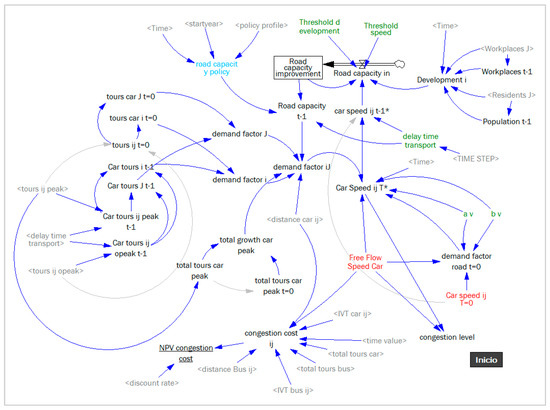 The transport and land use sub-models are executed iteratively over a certain period of years. The results of the simulations in terms of variables and indicators are used for the policy assessment. Figure A1, Figure A2 and Figure A3 show some simplified causal loops for calculating some of them.