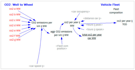 Simplified causal loop diagram of cars CO2 calculations in MARS model.