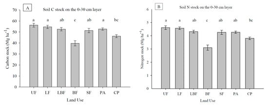 - Assad, E.D.; Pinto, H.S.; Martins, S.C.; Groppo, J.D.; Salgado, P.R.; Evangelista, B.; Vasconcellos, E.; Sano, E.E.; Pavão, E.; Luna, R.; et al. Changes in soil carbon stocks in Brazil due to land use: Paired site comparisons and a regional pasture soil survey. Biogeosciences 2013, 10, 6141–6160. [Google Scholar] [CrossRef]