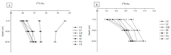 3.3.3. δ13C Values and C Derived from Forest and Pasture