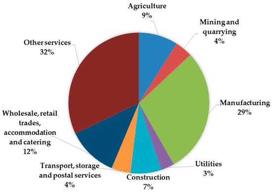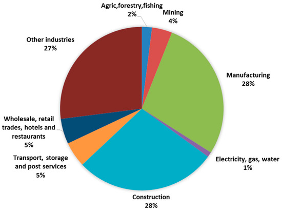 Most of these sectors that contribute significantly to carbon emissions also contribute significantly to the economic well-being of China. The country has to make a balance between economics and environment since a lower carbon society and maintaining a growing economy are both goals to achieve. To investigate the social and economic contributions, we calculate value added to measure each sector’s GDP and compare the relative contribution of each sector to overall GDP in China in 2016 (Figure 2). As we expected, manufacturing and other services contribute 29% and 32% to the overall GDP, respectively. However, construction contributes only 7% to GDP, whilst producing 28% of China’s emissions. In contrast, wholesale, retail trades, accommodation and catering contribute 12% to GDP, while producing only 6% of China’s emissions. This is not difficult to understand since China is a country with large-scale construction. Over one-tenth of all the new buildings around the world every year come from China. In addition, the reconstruction rate of China’s construction industry is relatively high and the quality of construction is poor. Another important reason for the high embodied emissions of construction is that large quantities of raw materials (such as cement) with high carbon emissions are used in construction. Although the Chinese government has been trying to encourage transformation of the construction industry, most of the green buildings still appear as public buildings or at key areas and the applications of green technology in construction are still inadequate.
